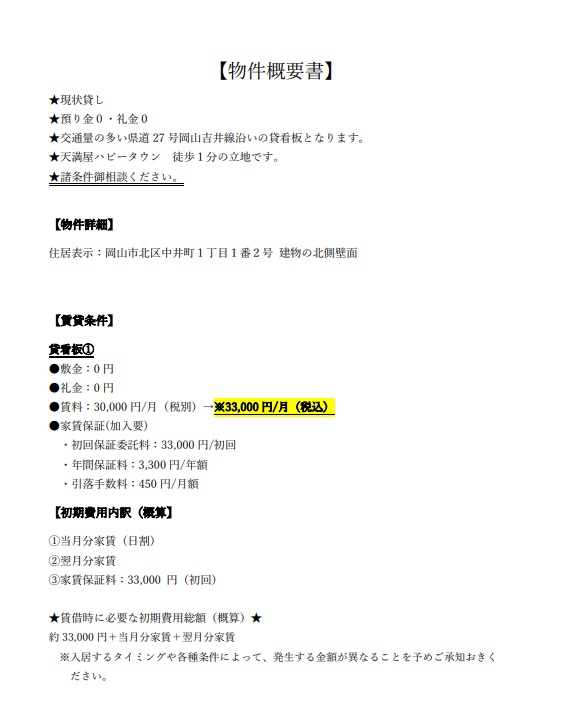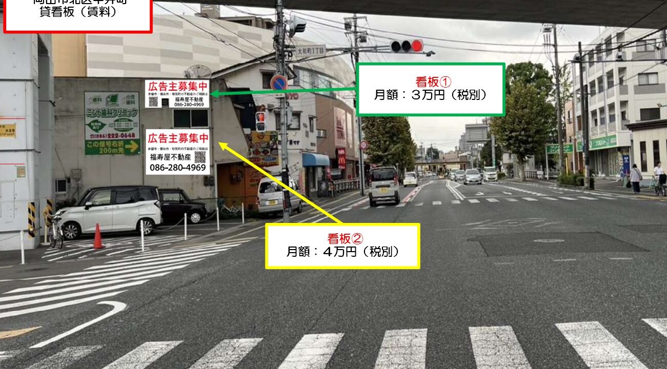 【貸看板】岡山県岡山市北区中井町1丁目1番2号 北側壁面看板①・② ★看板①:賃料 月額3万円(税別)・看板サイズ:約1200×約3000★看板②:賃料 月額4万円(税別)・看板サイズ:約2000×約3000※諸条件御相談ください。 投稿日2026年1月5日投稿者ise